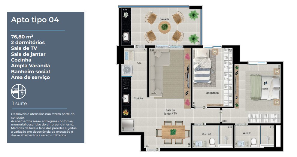 - Área Privativa: 76,80 m²
